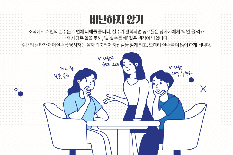 그래서 동료의 실수를 줄이는 첫 번째 방법은 ‘비난하지 않기’입니다. ‘저 사람은 원래 그래’라는 고정관념보다는 나아질 수 있다는 긍정적 관점으로 봐야 ‘함께’ 실수를 개선해 갈 수 있습니다. 조직에서 한 구성원의 실수는 개인의 노력으로 없애기에 한계가 있죠. 동료들의 도움이 꼭 필요합니다. 자, 이제 실수가 잦은 동료를 도울 준비되셨나요?