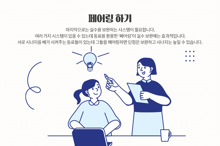 마지막으로는 실수를 보완하는 시스템이 필요합니다. 여러 가지 시스템이 있을 수 있는데 동료를 활용한 ‘페어링’이 실수 보완에는 효과적입니다. 화이트 와인은 생선과 해물의 비린내를 잡아주고, 레드 와인은 육류의 단백질을 부드럽게 해줘 서로 시너지를 내는데, 이를 페어링이라고 합니다. 업무에서도 마찬가지입니다.