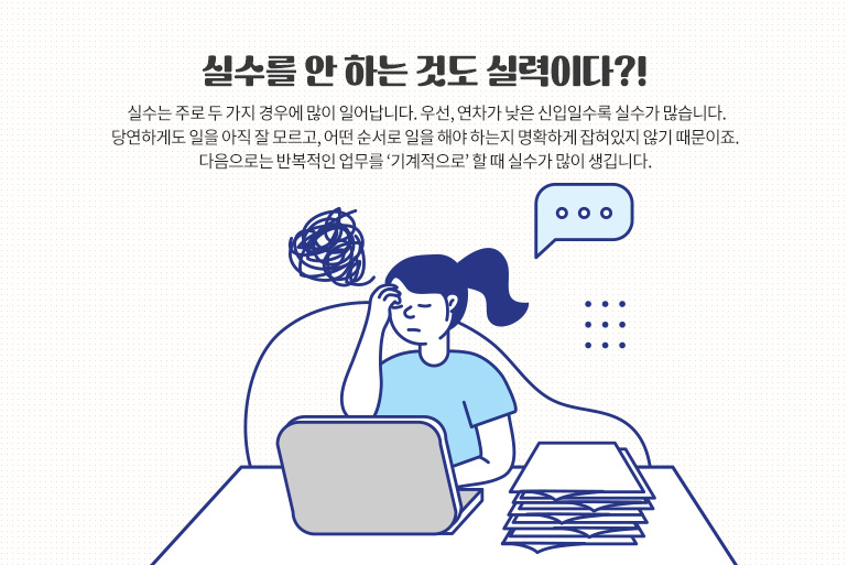 실수는 주로 두 가지 경우에 많이 일어납니다. 우선, 연차가 낮은 신입일수록 실수가 많습니다. 당연하게도 일을 아직 잘 모르고, 어떤 순서로 일을 해야 하는지 명확하게 잡혀있지 않기 때문이죠. 다음으로는 반복적인 업무를 ‘기계적으로’ 할 때 실수가 많이 생깁니다.