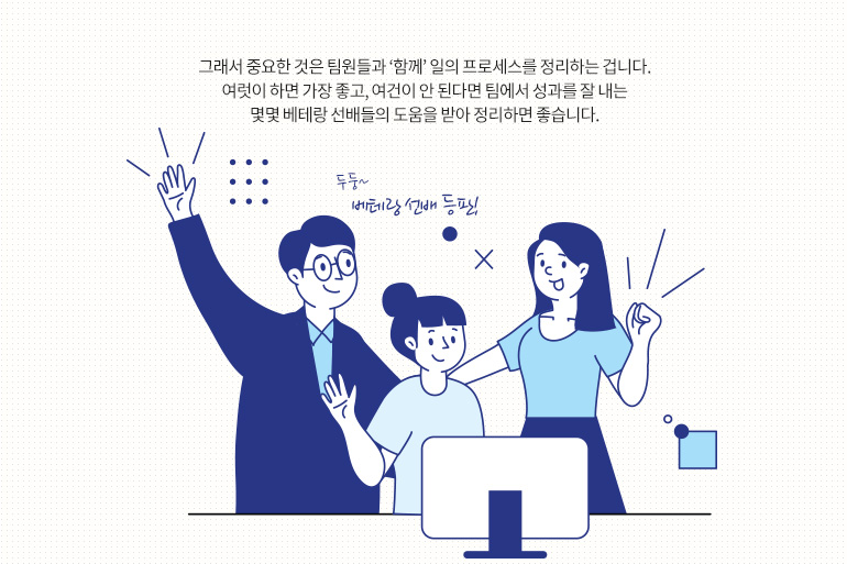 그래서 중요한 것은 팀원들과 ‘함께’ 일의 프로세스를 정리하는 겁니다. 여럿이 하면 가장 좋고, 여건이 안 된다면 팀에서 성과를 잘 내는 몇몇 베테랑 선배들의 도움을 받아 정리하면 좋습니다. 일의 전체 프로세스를 묻기에 부담된다면 ‘콘텐츠 기획을 할 때, 고객 관점에서 생각하는 걸 놓치곤 하는데 선배는 어떻게 하세요?’라는 식으로 실수가 잦은 부분에 대한 질문을 하는 거죠.