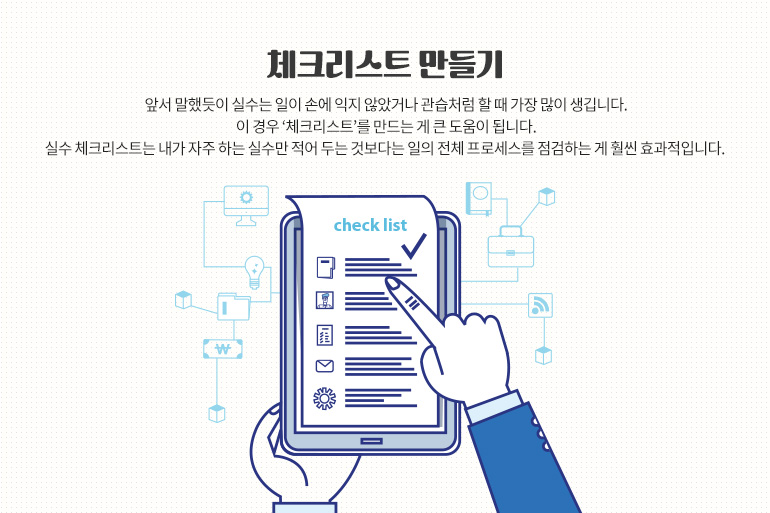 뭘 도와야 할까요? 앞서 말했듯이 실수는 일이 손에 익지 않았거나 관습처럼 할 때 가장 많이 생깁니다. 이 경우 ‘체크리스트’를 만드는 게 큰 도움이 됩니다. 실수 체크리스트는 내가 자주 하는 실수만 적어 두는 것보다는 일의 전체 프로세스를 점검하는 게 훨씬 효과적입니다.
