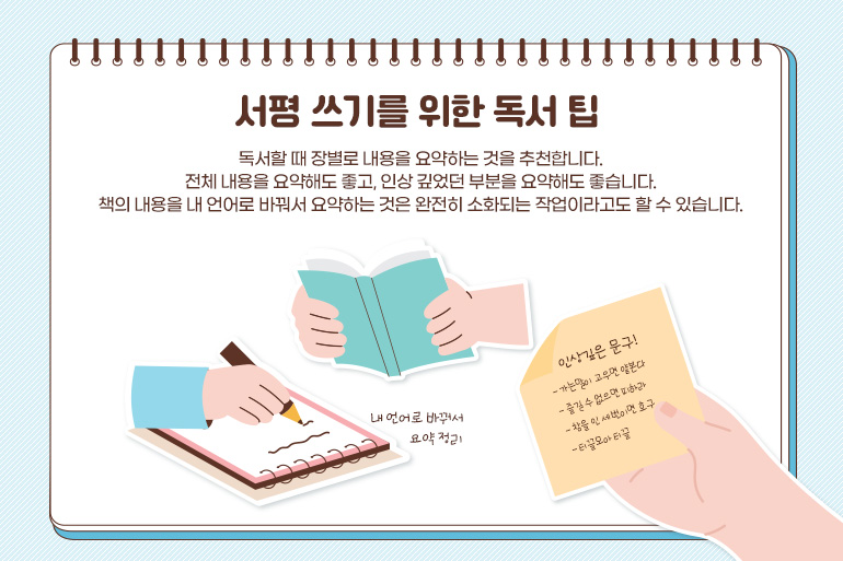 독서할 때 장별로 내용을 요약하는 것을 추천합니다. 전체 내용을 요약해도 좋고, 인상 깊었던 부분을 요약해도 좋습니다. 책의 내용을 내 언어로 바꿔서 요약하는 것은 완전히 소화되는 작업이라고도 할 수 있습니다. 내용을 다시 정리함으로써 오래 기억할 수 있죠. 또, 책을 읽다가 마음에 드는 구절이 있으면 밑줄을 치거나 메모지를 사용해서 적어 놓으세요. 그리고 그에 대한 내 생각을 쓰면 좋습니다. 저자가 쓴 글에 동의한다면 그 이유에 대해, 아니라면 왜 그런 생각이 드는지 써 보세요.