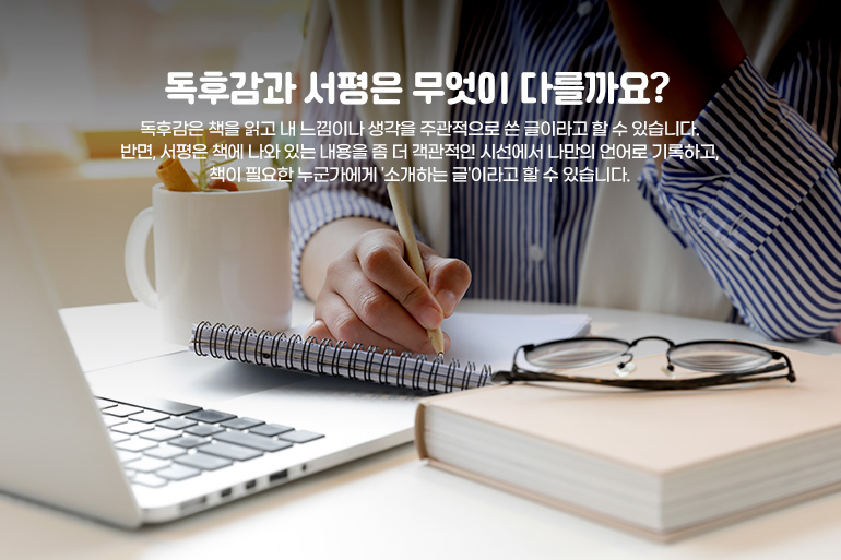 독후감은 책을 읽고 내 느낌이나 생각을 주관적으로 쓴 글이라고 할 수 있습니다. 반면, 서평은 책에 나와 있는 내용을 좀 더 객관적인 시선에서 나만의 언어로 기록하고, 책이 필요한 누군가에게 '소개하는 글'이라고 할 수 있습니다. 감상은 책을 수동적으로 받아들이게 하지만, 서평은 능동적인 시선에서 책을 대하기에 비판적인 사고가 확장됩니다. 책의 내용을 정리하면서 논리력이 좋아지고, 글쓰기에서 필요한 문장력과 표현력이 좋아지는 건 두말할 것 없는 사실이겠죠.