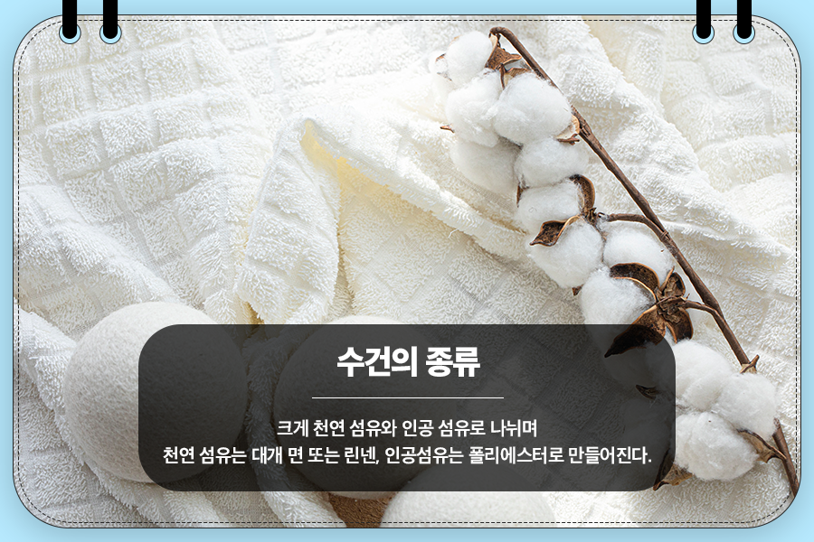 이처럼 우리의 일상과 가까이 있는 수건에도 다양한 종류가 있습니다.