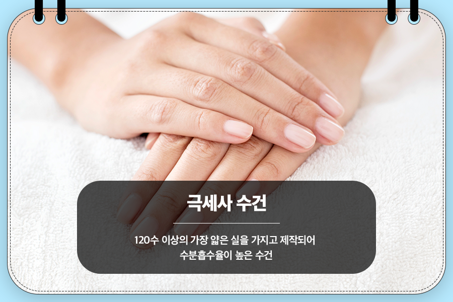 120수 이상의 얇은 실로 제작하는 극세사 수건의 수분 흡수율은 일반적인 수건의 2~5배 이상이라고 합니다. 이러한 높은 수분 흡수율을 자랑하며 운동 타월이나 세차용 수건으로도 사용되는 극세사 수건은 머리카락의 100분의 1보다 얇은 실로 제작되는데요, 섬유조직이 매우 촘촘하여 피부질환이나 비염 환자에게 도움이 될 수 있습니다. 그러나 제작 과정의 특성상, 내구성이 다소 약하다는 단점도 있어 일반 가정보다는 고급 호텔과 같은 곳에서 많이 사용된다고 합니다.