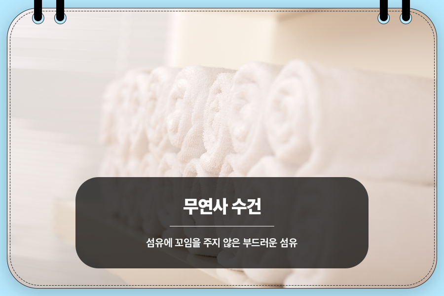 호텔의 수건이나 샤워 가운에 많이 사용되는 무연사 수건은 면사 수건과 달리 섬유에 꼬임을 주지 않고 제작되어 일반 면사 수건보다 부드러운 촉감과 가벼운 무게가 장점인 수건입니다. 이러한 무연사 수건은 비교적 제작비용이 높아 일반 가정에서 사용하기에 부담이 될 수 있지만, 포근하고 부드러운 촉감으로 피부가 예민한 소비자나 어린이들에게는 인기가 높은 수건입니다.