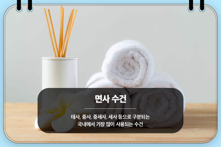 목화 섬유로 제작된 면사 수건은 국내에서 가장 많이 사용되는 수건 중 하나입니다. 면사 수건은 실의 굵기에 따라 태사(24번 수 이하), 중사(24~40번 수), 중세사(40~60번 수), 세사(60~120번 수), 극세사(120번 수 이상) 등 5개 정도의 종류로 구분되는데요, 면사 수건은 높은 흡수성으로 피부 알레르기 반응이 적고, 내구성이 좋아 장기간 사용이 가능하다는 장점이 있습니다.