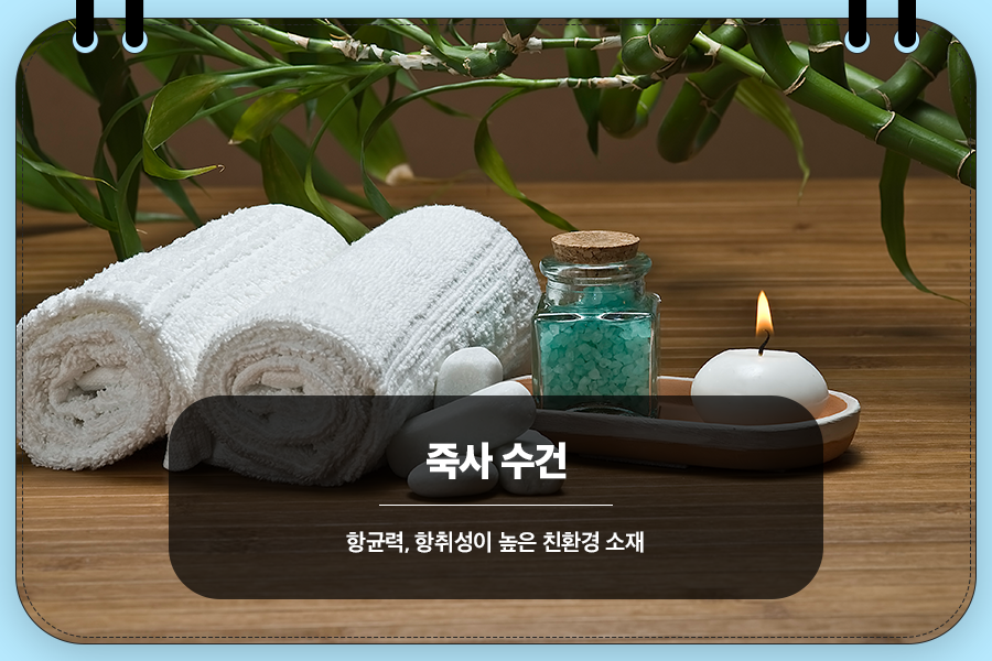 죽사 수건은 대나무 펄프를 짜서 실로 제작한 섬유로 만든 수건입니다. 대나무는 자랄 수 있는 기후환경이 한정적이고 대나무 자체의 항균 효능도 포함되어 있어 친환경과 웰빙에 관심이 높아진 요즘 죽사 소재의 인기가 높아지고 있다고 합니다. 대나무에서 추출한 셀룰로오즈를 재생해 만드는 죽사 소재는 부드러운 촉감을 지니며, 대나무의 아미노산과 유기산 등 영양분으로 높은 항균력을 자랑합니다. 이러한 죽사 소재는 가성비가 좋아 수건 외의 다양한 생활용품에 사용되기도 합니다.