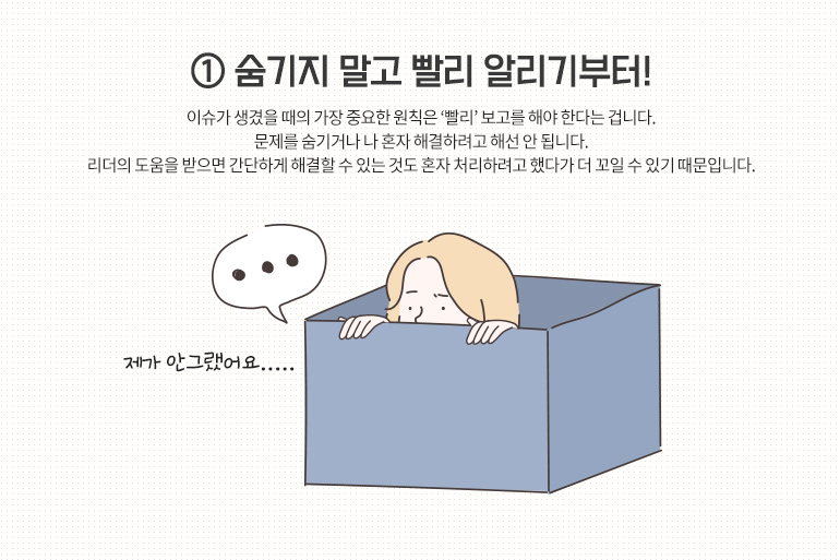 이런 모습이 내가 일을 ‘덜’ 했다는 ‘낙인’이 될까 걱정되시나요? 오히려 책임을 인정하는 모습은 리더에게 신뢰를 줍니다. ‘왜’ 문제가 생겼는지, 문제가 안 생기려면 내가 뭘 더 했어야 하는지 고민하는 사람만이 다음에 같은 일이 생기지 않게 대비할 수 있기 때문이죠. 무엇보다 문제 상황을 보고하는 이유, 즉 리더의 지원을 받기 위함을 생각해 보세요. 나 몰라라 하는 사람보다는 자신의 책임을 인정하고 미안해하는 사람을 더 도와주고 싶겠죠?