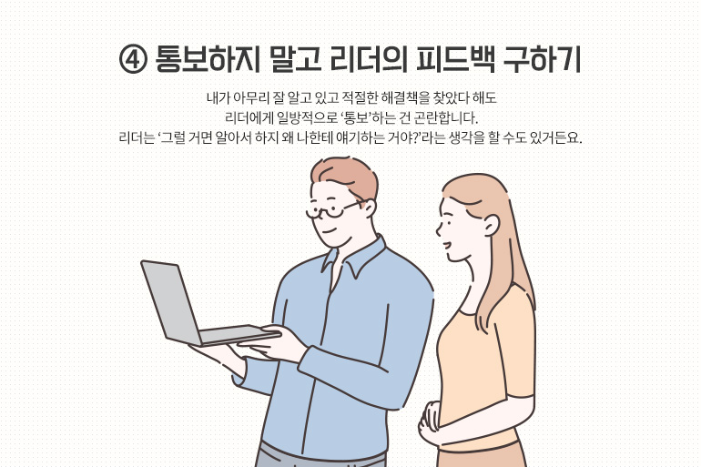 마지막은 내 제안에 대한 리더의 ‘피드백’을 구하는 것입니다. 내가 아무리 잘 알고 있고 적절한 해결책을 찾았다 해도 리더에게 일방적으로 ‘통보’하는 건 곤란합니다. 리더는 ‘그럴 거면 알아서 하지 왜 나한테 얘기하는 거야?’라는 생각을 할 수도 있거든요.