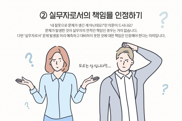 두 번째는 문제 상황이 생긴 것에 대한 책임을 ‘인정’해야 합니다. ‘내 잘못으로 문제가 생긴 게 아닌데요?’란 의문이 드시나요? 네, 맞습니다. 문제가 발생한 것이 실무자의 전적인 책임인 경우는 거의 없습니다. 다만 ‘실무자로서’ 문제 발생을 미리 예측하고 대비하지 못한 것에 대한 책임은 인정해야 한다는 의미입니다. 예를 들면 “죄송합니다. 제가 물량 변동을 예측하고 플랜 B 준비를 했었어야 하는데 오랜 고객이라 안일하게 관리했습니다.” 정도면 충분합니다.
