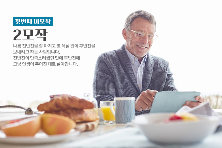 첫째, '2모작'을 짓는 이들입니다. 이들은 나름 전반전을 잘 마치고 별 욕심 없이 후반전을 보내려고 하는 사람입니다. 전반전을 너무 열심히 뛴 탓에 체력이 딸려 후반전은 쉬엄쉬엄하거나, 아니면 전반전이 만족스러웠던 탓에 후반전에 그냥 인생이 주어진 대로 살아갑니다. 대부분의 사람들이 이런 경우에 해당할 것입니다.