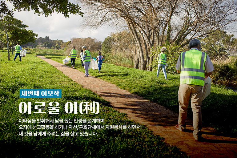 셋째, '이로울 이(利)'의 이모작을 짓는 이들입니다. 이제는 좀 더 여유를 갖고 나와 가족이 아닌, 사회를 위해 살겠다는 사람들입니다. 이타심을 발휘해서 남을 돕는 인생을 설계하며 오지에 선교활동을 하거나 자선/구호단체에서 자원봉사를 하면서 내 것을 남에게 주려는 삶을 살고 있습니다. 많은 것을 내려놓기 위해 사는 사람들이 여기에 해당합니다.