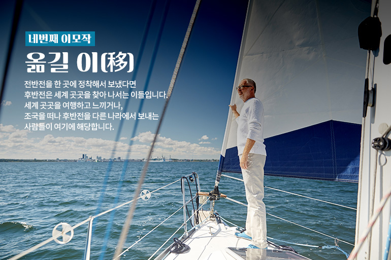 넷째, '옮길 이(移)'의 이모작을 짓는 사람들입니다. 전반전을 한 곳에 정착해서 보냈다면 후반전은 붙박이에서 탈피해 세계 곳곳을 찾아 나서는 이들입니다. 전반전에 경험하지 못한 것들에 대해 가능한 많은 곳을 보고 느끼려는 부류입니다. 세계 곳곳을 여행하고 느끼거나, 조국을 떠나 후반전을 다른 나라에서 보내는 사람들이 여기에 해당합니다. 최근 대부분의 사람들이 좋아하는 이모작의 방법 중 하나일 것입니다.