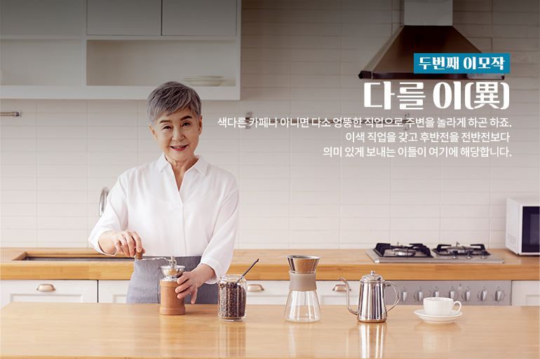 둘째, '다를 이(異)'의 이모작을 짓는 이들입니다. 전반전을 마친 뒤 엉뚱한 것 하거나 생각지도 못한 것을 하는 이들입니다. 색다른 카페나 아니면 다소 엉뚱한 직업으로 주변을 놀라게 하곤 하죠. 이색 직업을 갖고 후반전을 전반전보다 의미 있게 보내는 이들이 여기에 해당합니다.