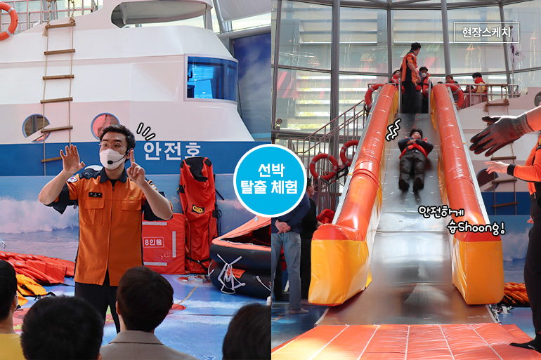 마지막 시간은 체험교육의 하이라이트라고 할 수 있는 선박 대피 훈련이었습니다. 배가 암초에 걸려서 흔들릴 때 탈출하는 상황을 가정해 교육이 진행되었는데요. 탈출 체험에 앞서 강사님께서 배를 타면 비상 집합장소가 어디인지 확인하고, 구명조끼를 입고 있으면 부력에 의해 탈출이 어려우니 선실 밖에서 구명조끼를 입어야 한다든지 등의 주의사항을 말씀해 주셨습니다. 생각보다 슬라이드를 타고 내려오는 속도가 빠르기 때문에 안전요원분들의 도움을 받아 안전하게 체험을 완료하였답니다.