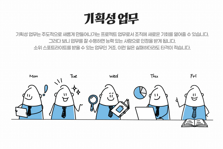 이에 반해 기획성 업무는 주도적으로 새롭게 만들어나가는 프로젝트 업무로서 조직에 새로운 기회를 열어줄 수 있습니다. 그러다 보니 업무를 잘 수행하면 능력 있는 사람으로 인정을 받게 됩니다. 소위 스포트라이트를 받을 수 있는 업무인 거죠. 이런 일은 실패하더라도 타격이 적습니다. 새롭게 도전한 일이기 때문에 그럴 수 있다고 받아들이는 분위기이니까요. 영업으로 치면 운영성 업무는 ‘기존 고객관리’에 해당하고 기획성 업무는 ‘신규 고객 유치 전략 모색’ 정도가 될 수 있겠죠.