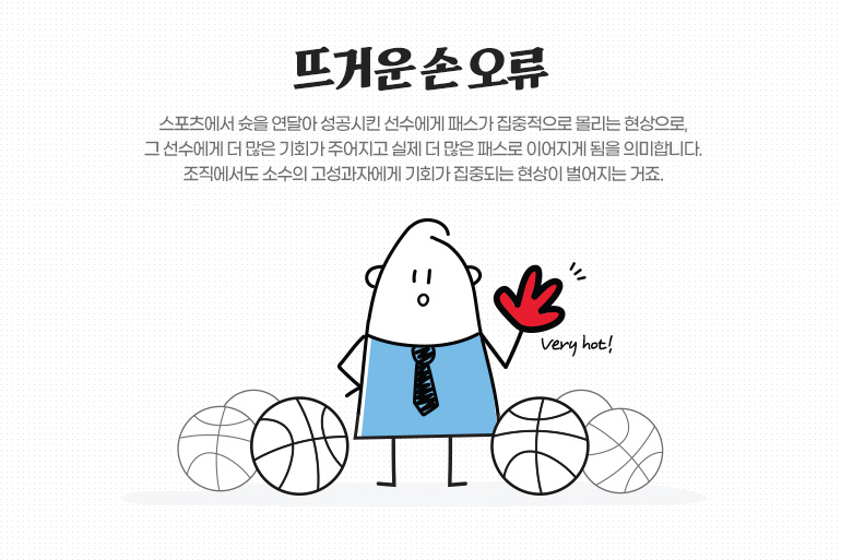 이를 '뜨거운 손 오류'라고 부르는데요. 스포츠에서 슛을 연달아 성공시킨 선수에게 패스가 집중적으로 몰리는 현상으로, 그 선수에게 더 많은 기회가 주어지고 실제 더 많은 패스로 이어지게 됨을 의미합니다. 조직에서도 소수의 고성과자에게 기회가 집중되는 현상이 벌어지는 거죠.