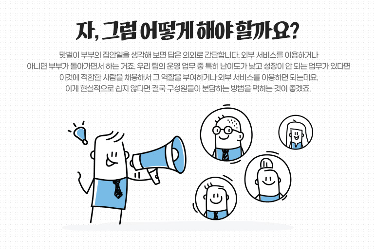 자, 그럼 어떻게 해야 할까요? 맞벌이 부부의 집안일을 생각해 보면 답은 의외로 간단합니다. 외부 서비스를 이용하거나 아니면 부부가 돌아가면서 하는 거죠. 우리 팀의 운영 업무 중 특히 난이도가 낮고 성장이 안 되는 업무가 있다면 이것에 적합한 사람을 채용해서 그 역할을 부여하거나 외부 서비스를 이용하면 되는데요. 이게 현실적으로 쉽지 않다면 결국 구성원들이 분담하는 방법을 택하는 것이 좋겠죠. 어찌 보면 다소 비효율적인 면도 있을 수 있지만 ‘성장’과 ‘공정’의 가치를 외면한다면 더 큰 부작용을 감당해야 할 테니까요.