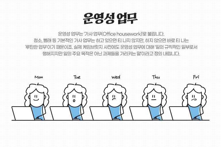 대부분의 구성원은 운영성 업무에 비해 성장 가능성이 크고 관심과 인정의 기회가 훨씬 큰 기획성 업무를 선호합니다. 이런 차이 때문일까요? 영어권에서도 기획성 업무는 ‘화려한 업무(Glamour work)’로, 운영성 업무는 ‘가사 업무(Office housework)’로 불립니다. 청소, 빨래 등 기본적인 가사 업무는 하고 있으면 티 나지 않지만, 하지 않으면 바로 티 나는 '루틴한 업무'이기 때문이죠. 실제 케임브릿지 사전에도 운영성 업무에 대해 ‘일의 규칙적인 일부로서 행해지지만 일의 주요 목적은 아닌 과제들을 가리키는 말’이라고 정의 내립니다.