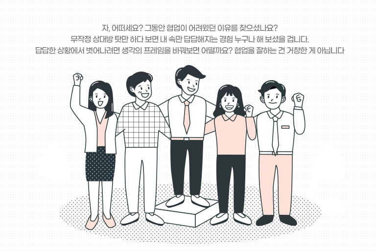 자, 어떠세요? 그동안 협업이 어려웠던 이유를 찾으셨나요? 무작정 상대방 탓만 하다 보면 내 속만 답답해지는 경험 누구나 해 보셨을 겁니다. 답답한 상황에서 벗어나려면 생각의 프레임을 바꿔보면 어떨까요? 협업을 잘하는 건 거창한 게 아닙니다. 상대에 대한 조금만 더 관심을 가지고, 약간의 배려를 더하면 훨씬 수월하게 풀릴 문제들이 많습니다. 누구나 잘하려고 애쓰는 사람들이 모인 회사에서 서로를 알고 배려하는 마음이 모인다면 당연히 좋은 성과가 나오지 않을까요?