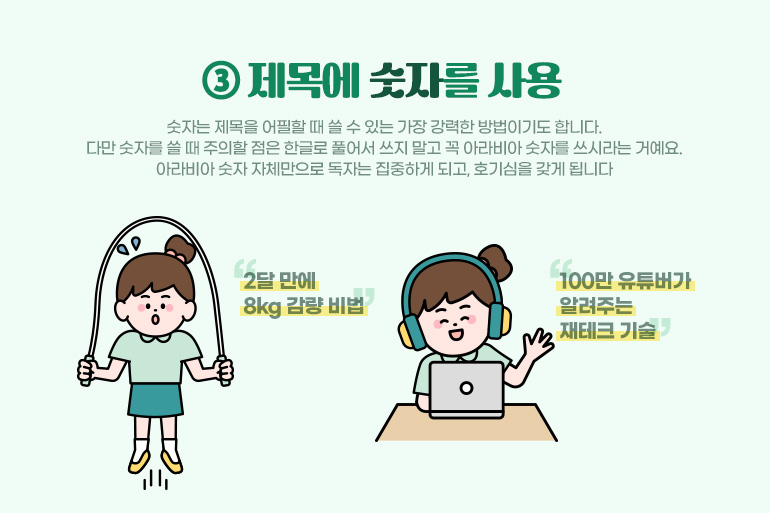 숫자는 제목을 어필할 때 쓸 수 있는 가장 강력한 방법이기도 합니다. 다만 숫자를 쓸 때 주의할 점은 한글로 풀어서 쓰지 말고 꼭 아라비아 숫자를 쓰시라는 거예요. 아라비아 숫자 자체만으로 독자는 집중하게 되고, 호기심을 갖게 됩니다. ‘3초 안에 고객을 사로잡는 SNS 마케팅 5가지 법칙’, ‘100만 유튜버가 알려주는 재테크 기술’, ‘30일 안에 3kg 체중 감량 성공하는 법’ 등을 예로 들 수 있습니다. 숫자는 일 단위까지 구체적으로 써 주는 것이 좋습니다.