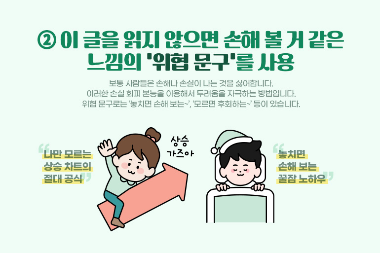 보통 사람들은 손해나 손실이 나는 것을 싫어합니다. 이러한 손실 회피 본능을 이용해서 두려움을 자극하는 방법입니다. 위협 문구로는 ‘놓치면 손해 보는~’, ‘모르면 후회하는~’ 등이 있습니다. ‘놓치면 100만 원 손해 보는 부동산 세금 가이드’, ‘모르면 후회하는 상표 등록 방법’ 등으로 쓸 수 있습니다.