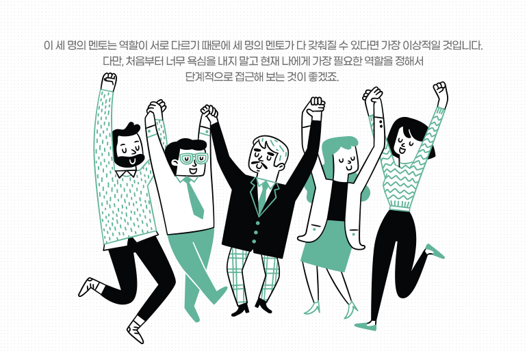 이 세 명의 멘토는 역할이 서로 다르기 때문에 세 명의 멘토가 다 갖춰질 수 있다면 가장 이상적일 것입니다. 다만, 처음부터 너무 욕심을 내지 말고 현재 나에게 가장 필요한 역할을 정해서 단계적으로 접근해 보는 것이 좋겠죠. 대체불가능한 ‘직업인’으로 성장하고 싶다고요? 그렇다면 Bettor, Best Performer, Buddy의 역할을 해 줄 멘토들을 꼭 찾으시길 바랍니다.