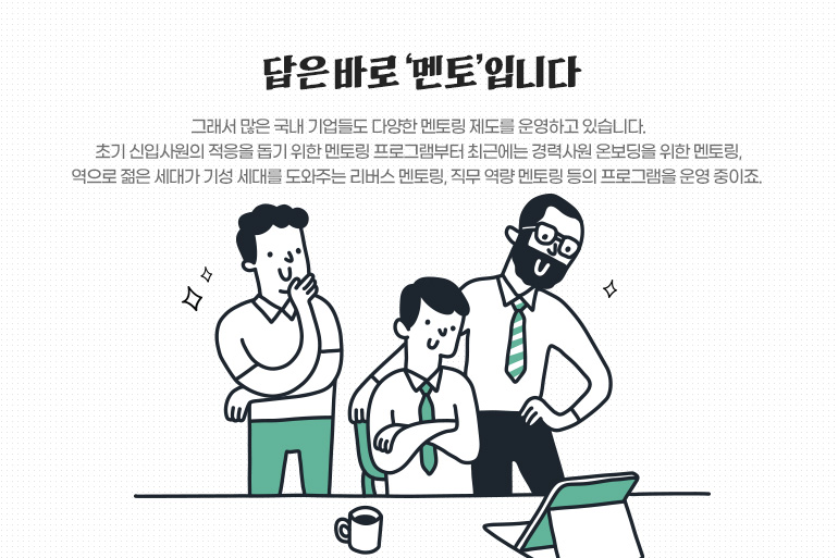 이처럼 멘토가 얼마나 중요한 역할을 하는지는 두 번 말하면 잔소리일 텐데요. 그래서 많은 국내 기업들도 다양한 멘토링 제도를 운영하고 있습니다. 초기 신입사원의 적응을 돕기 위한 멘토링 프로그램부터 최근에는 경력사원 온보딩을 위한 멘토링, 역으로 젊은 세대가 기성 세대를 도와주는 리버스 멘토링, 직무 역량 멘토링 등의 프로그램을 운영 중이죠.