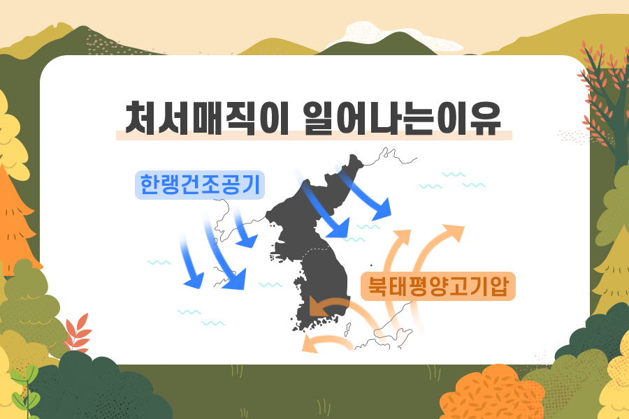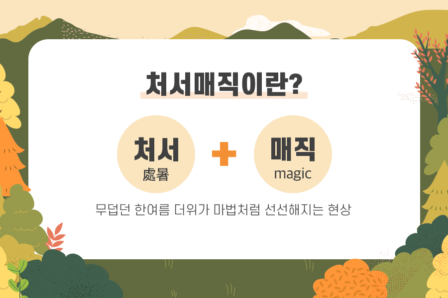 처서(處暑) + 매직(magic)의 합성어로 처서쯤에는 무덥던 한여름 더위가 갑자기 선선해지면서 마법처럼 더위가 사그라든다고 해서 만들어진 단어입니다. 실제로 처서가 지나면 전국에 내렸던 폭염특보도 해제되고 열대야도 사라지는 것을 느낄 수 있는데요.