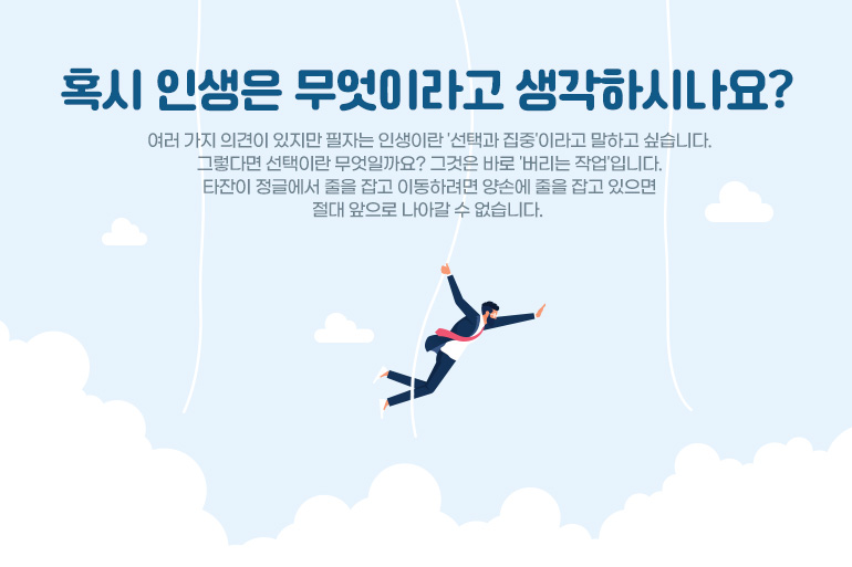 혹시 인생은 무엇이라고 생각하시나요? 여러 가지 의견이 있지만 필자는 인생이란 '선택과 집중'이라고 말하고 싶습니다. 그렇다면 선택이란 무엇일까요? 그것은 바로 '버리는 작업'입니다. 타잔이 정글에서 줄을 잡고 이동하려면 양손에 줄을 잡고 있으면 절대 앞으로 나아갈 수 없습니다. 한 손은 놓으면서 다른 한 손을 뻗는 선택을 해야 하죠. 앞으로 나아가는 것에만 집중하면 된다는 것입니다.