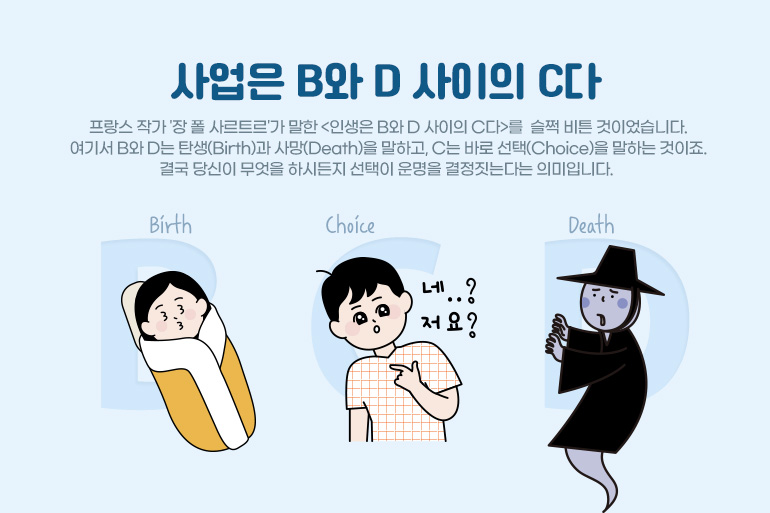 필자가 1인 기업가라는 일을 막 시작하면서 이런 이야기를 들은 적이 있습니다. <사업은 B와 D 사이의 C다> 처음 이 문장을 접했을 때는 어떤 의미인지 몰랐습니다. 알고 보니 프랑스 작가 '장 폴 사르트르'가 말한 <인생은 B와 D 사이의 C다>를 슬쩍 비튼 것이었습니다. 여기서 B와 D는 탄생(Birth)과 사망(Death)을 말하고, C는 바로 선택(Choice)을 말하는 것이죠. 결국 당신이 무엇을 하시든지 선택이 운명을 결정짓는다는 의미입니다.