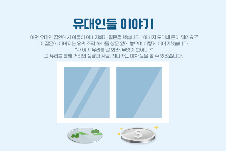 유대인들 사이에 내려오는 이야기 하나를 더 소개하겠습니다. 어떤 유대인 집안에서 아들이 아버지에게 다음과 같이 질문을 했습니다. “아버지 도대체 돈이 뭐예요?” 이 질문에 아버지는 유리 조각 하나를 창문 앞에 놓으며 이렇게 이야기했습니다. “자 여기 유리를 잘 봐라. 무엇이 보이니?” 아들은 그 유리를 통해 거리의 풍경과 사람, 지나가는 마차 등을 볼 수 있었습니다.