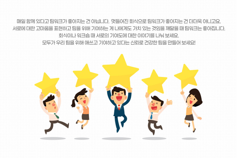 매일 함께 있다고 팀워크가 좋아지는 건 아닙니다. 멋들어진 회식으로 팀워크가 좋아지는 건 더더욱 아니고요. 서로에 대한 고마움을 표현하고 팀을 위해 기여하는 게 나에게도 가치 있는 것임을 깨달을 때 팀워크는 좋아집니다. 회식이나 워크숍 때 서로의 기여도에 대한 이야기를 나눠 보세요. 처음에는 다들 민망해할 겁니다. 그렇지만 한 번, 두 번 하다 보면 기여도를 공유하는 것의 큰 힘을 느끼고 모두 적극적으로 참여하게 될 겁니다. 모두가 우리 팀을 위해 애쓰고 기여하고 있다는 신뢰로 건강한 팀을 만들어 보세요!