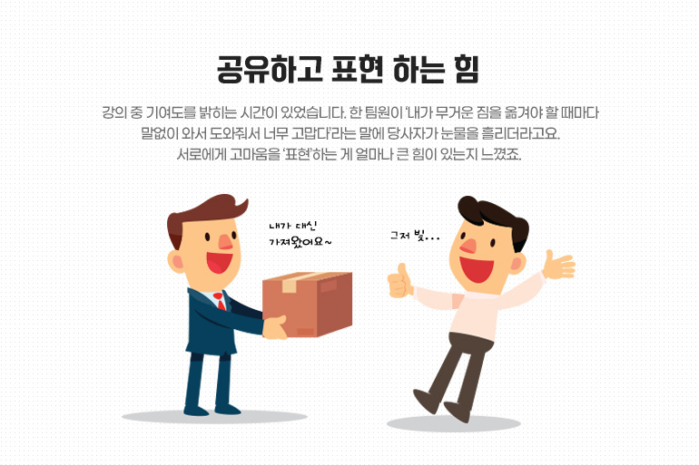 강의 중 기여도를 밝히는 시간이 있었습니다. 한 팀원이 ‘내가 무거운 짐을 옮겨야 할 때마다 말없이 와서 도와줘서 너무 고맙다’라는 말에 당사자가 눈물을 흘리더라고요. 서로에게 고마움을 ‘표현’하는 게 얼마나 큰 힘이 있는지 느꼈죠. 사소한 말들이 오간다고 하더라도, 이 시간을 갖다 보면 서로의 기여도를 알게 되는 것은 물론 끈끈한 유대감까지도 생깁니다. 그러면 자연스레 팀워크도 좋아지게 되죠.