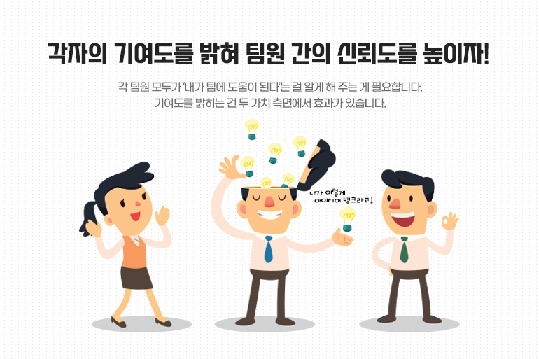 매일 함께 있다고 팀워크가 좋아지는 건 아닙니다. 멋들어진 회식으로 팀워크가 좋아지는 건 더더욱 아니고요. 서로에 대한 고마움을 표현하고 팀을 위해 기여하는 게 나에게도 가치 있는 것임을 깨달을 때 팀워크는 좋아집니다. 회식이나 워크숍 때 서로의 기여도에 대한 이야기를 나눠 보세요. 처음에는 다들 민망해할 겁니다. 그렇지만 한 번, 두 번 하다 보면 기여도를 공유하는 것의 큰 힘을 느끼고 모두 적극적으로 참여하게 될 겁니다. 모두가 우리 팀을 위해 애쓰고 기여하고 있다는 신뢰로 건강한 팀을 만들어 보세요!