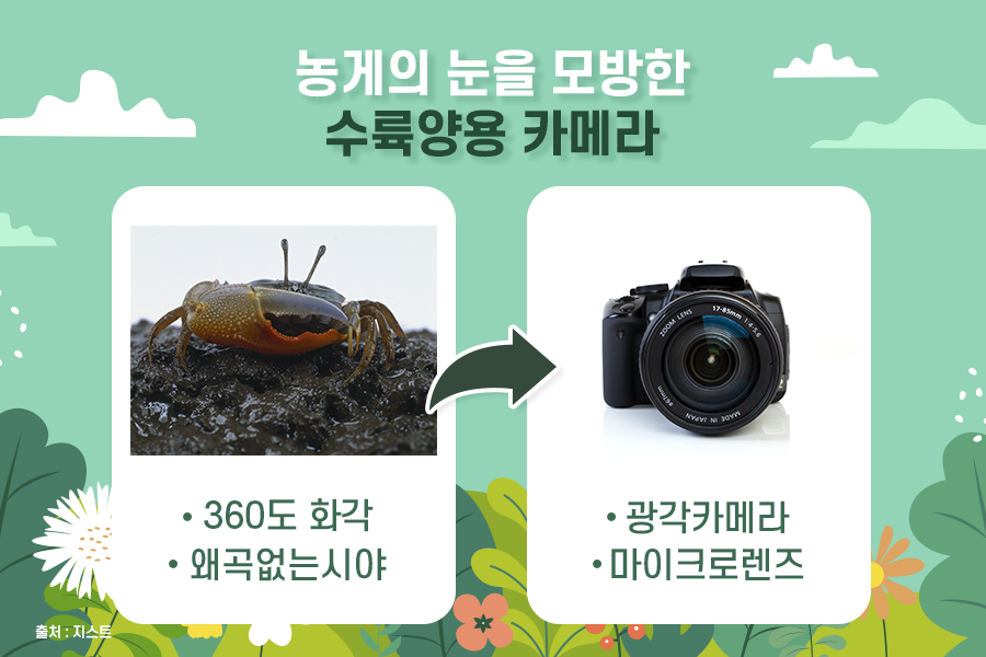 사람은 눈동자의 방향과 몸의 방향에 따라서 볼 수 있는 시야가 달라지는 한정적인 화각을 갖고 있습니다. 반면, 농게의 눈은 홑눈이 여러 개가 모여 다발을 이루는 겹눈 구조로 되어 있습니다. 이러한 겹눈 구조의 눈 덕분에 농게는 한 번에 360도를 볼 수 있는 시야를 갖고 있습니다. 360도의 화각과 왜곡없이 사물을 볼 수 있는 농게의 특성을 이용하여 수륙양용 카메라가 개발되었습니다. 편평형 마이크로렌즈를 사용하며 구조물 안에 200여 개의 왜곡없는 광각 카메라를 삽입하여 농게의 홑눈을 모방한 것입니다. 이를 통해 환경에 상관없는 동일한 화질을 가진 360도 화각의 신개념 카메라가 개발되었습니다. 이렇게 개발된 카메라는 자율주행차, 스마트폰, 반도체 이미지 센서 등에 사용될 예정입니다.