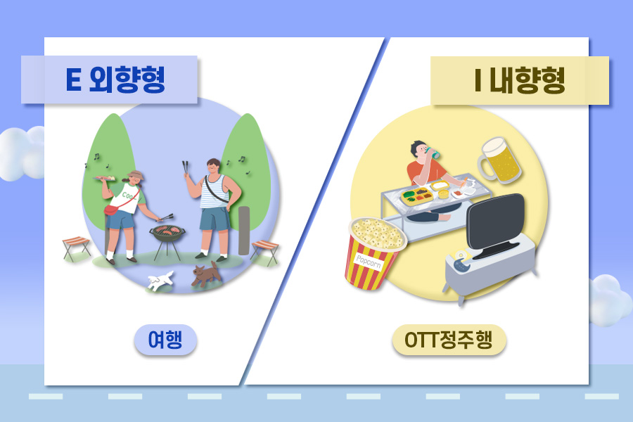 외향적인 성격인 E는 사람들과 어울리며 활동할 때 에너지가 생기는 것이 특징입니다. 활동 범위가 넓고 생동감이 넘치는 성격이라서 국내 당일치기 여행 또는 금요일 휴가를 사용해서 가까운 나라로 2박3일 해외여행을 떠나보는 건 어떨까요?