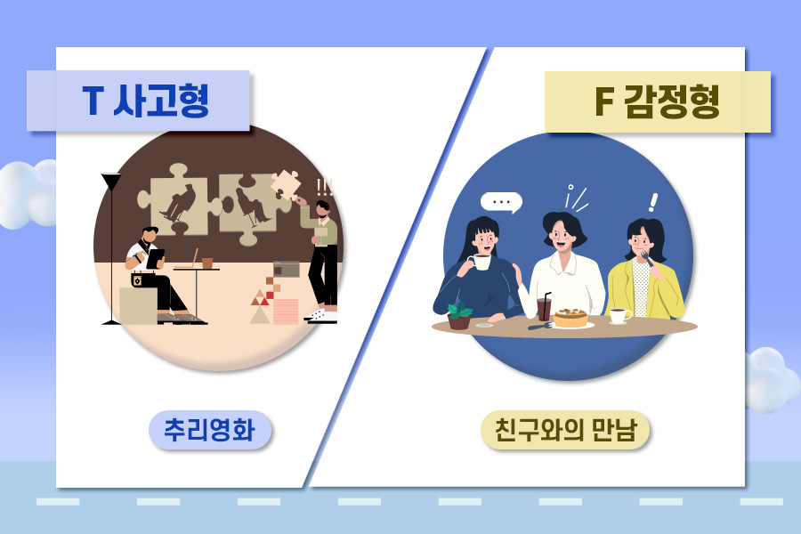 논리적이고 분석적인 성격이 특징인 T는 이성적 사고를 우선시합니다. 이러한 성향을 가진 사람에게는 추리소설 또는 추리영화를 보는 것을 추천합니다. 제시되는 상황을 조합하여 범인을 찾아내는 것에 몰입하면 스트레스 해소에도 도움이 됩니다.