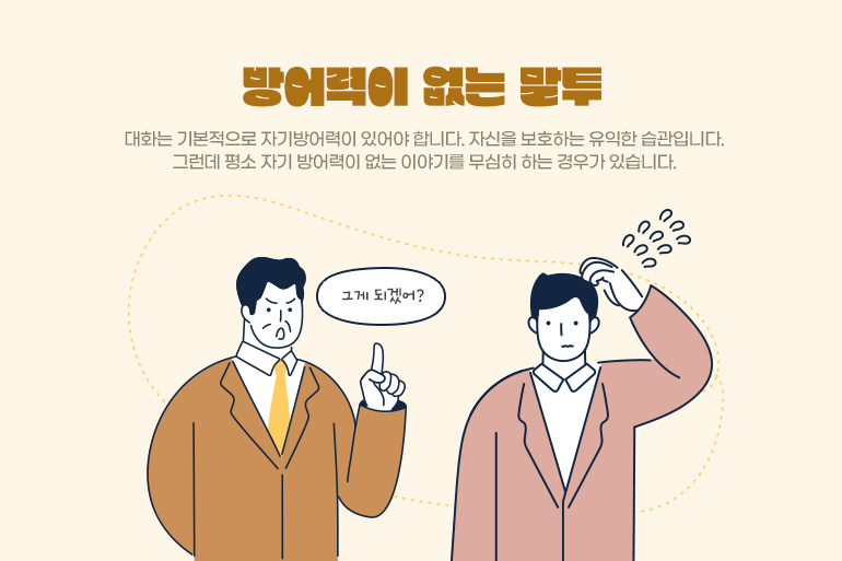 다양한 이유가 있지만, 제일 먼저 체크해봐야 할 것은 자신의 말 습관, 즉 '말투'입니다. 직장생활은 <말>에서 모든 것이 출발한다고 해도 과언이 아니죠. 업무를 진행하는 것도, 신뢰를 쌓는 것도 결국 <말>이 결정하기 때문입니다. 특히 좋은 말투를 골라내려고 노력하기보다는 쓰지 말아야 할 말을 조심하는 편이 훨씬 중요합니다. 그렇다면 직장에서 대표적으로 고쳐야 하는 말투는 무엇일까요?