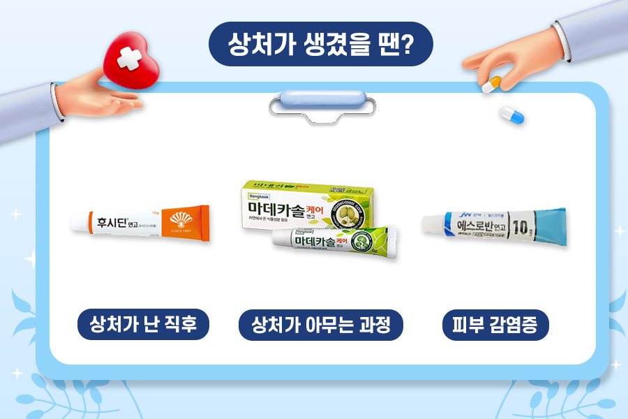 후시딘과 다르게 마데카솔은 상처가 아물어가는 과정에 사용해주는 것이 효과적입니다. 마데카솔에는 새살을 빨리 돋게 하는 콜라겐 합성을 촉진하는 센텔라 성분이 있어 흉터가 커지는 것을 예방해줍니다.