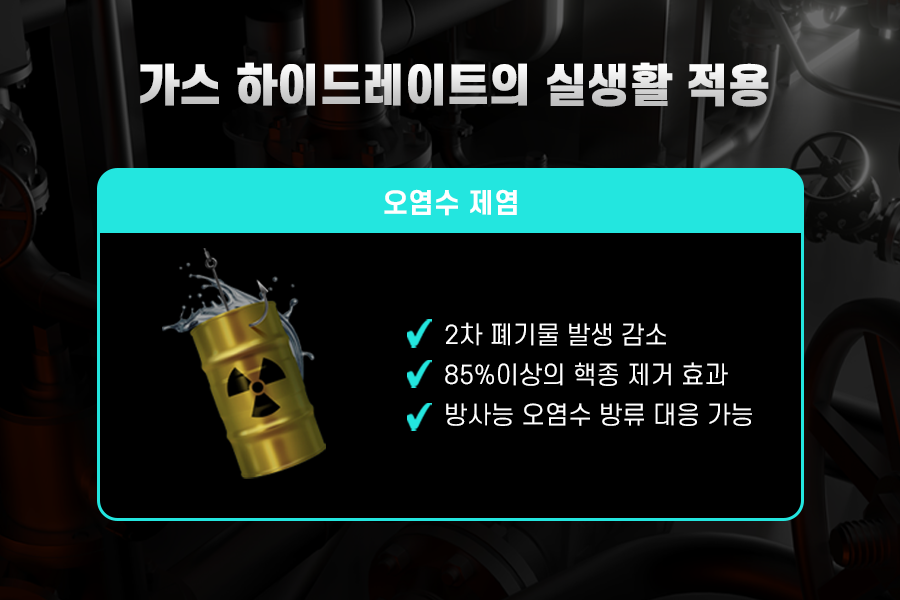 국내 연구진은 2019년 세계 최초로 가스 하이드레이트를 활용한 오염수 제염기술을 개발하는 데 성공했습니다. 가스 하이드레이트의 결정, 분리 과정의 원리를 오염수를 정화하는 방식에 응용한 것입니다. 하이드레이트 결정체가 어는 과정에서 물에 있는 대부분의 오염 물질이 배제되는 원리로 물리적 분리 현상을 활용해서 2차 폐기물 발생이 거의 없으며 1차 제염 과정에서 85% 이상의 핵종이 제거되는 효과가 있다고 합니다. 이는 방사능 오염수 방류에 신속하게 대응할 수 있어 많은 기대를 받고 있습니다.