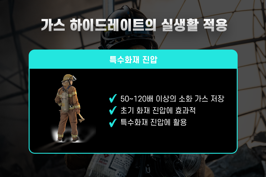 가스 하이드레이트의 장점인 고밀도 에너지를 활용하여 소화탄을 제작할 수 있습니다. 가스 하이드레이트는 별도의 저장공간 없이도 자체만으로도 50~120배 많은 소화 가스를 저장할 수 있습니다. 또한 소화탄은 가스 하이드레이트 결정 구조가 나노미터로 이루어져 있으므로 소화가스를 물리적으로 가둬둘 수 있습니다. 이러한 소화 가스가 들어있는 가스 하이드레이트가 화염과 만나면 녹으면서 물과 소화가스가 동시에 분출되는데, 이때 주위에 있는 열을 흡수하여 초기 화재 진압에 효과적입니다. 이러한 특징을 이용해 소화탄을 제작하여 산불이나 배터리 폭발, 화학공장 화재와 같은 특수화재가 발생했을 시 초기 진압에 유용하며 좁은 공간이나 높은 지대에서 발생한 화재를 진압하는 데도 활용될 예정입니다.