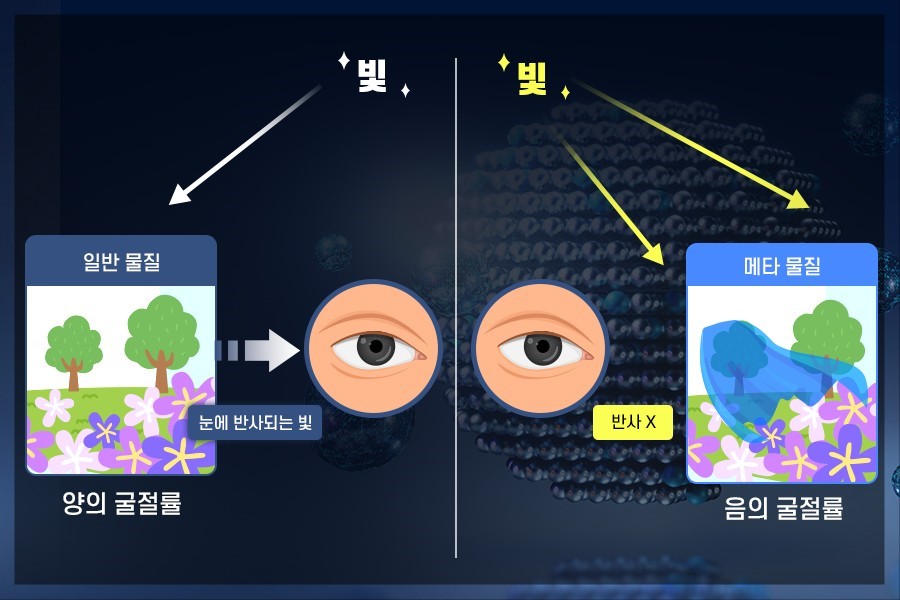 정답은 음의 굴절률입니다. 우리가 물체를 볼 수 있는 것은 물체로부터 반사되어 나오는 빛을 인식하는 것인데, 투명망토를 만들려면 빛이 반사되지 않거나 다른 쪽으로 휘어져 눈이 인식하지 못하도록 하면 됩니다. 자연계에 존재하는 대부분의 물질은 양의 굴절률을 가지고 있어 물체에 닿는 빛을 입사각 기준 오른쪽으로 굴절시킵니다. 반면 음의 굴절률을 가진 메타물질은 빛의 방향을 반대로 굴절시켜 빛이 물체의 표면을 지나가게 하기 때문에 빛이 반사되지 않아 물체를 볼 수가 없게 되는 것입니다.