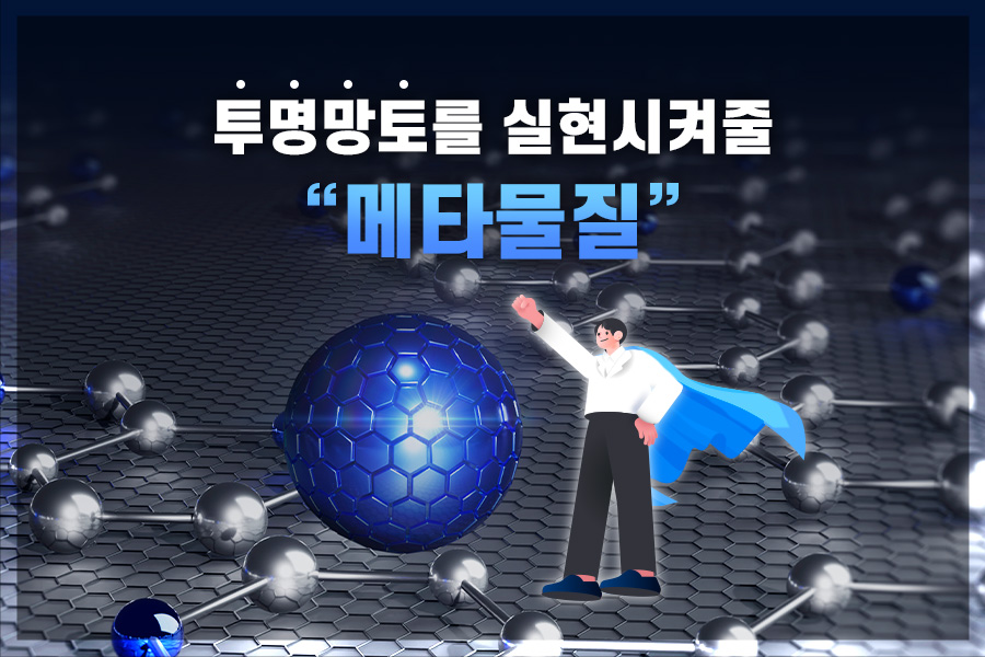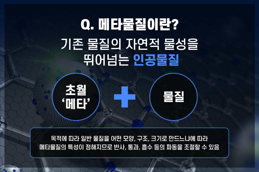 ‘메타물질’이란 초월을 뜻하는 ‘메타’와 ‘물질’을 결합한 단어로 자연에서 찾아볼 수 없는 특성을 갖도록 인위적으로 플라스틱과 금속 같은 일반 물질을 배열하고 접합해서 만들어집니다. 또한 원자보다 크고 입사하는 빛의 파장보다 매우 작은 인공구조를 주기적으로 배치하여 빛-물질 상호작용을 인공적으로 제어할 수 있는 신소재입니다. 모양, 구조, 크기, 방향, 배열에 따라서 메타물질의 특성이 정해지기 때문에 사용 목적에 따라 반사, 투과, 흡수 등의 파동을 조절할 수 있습니다.