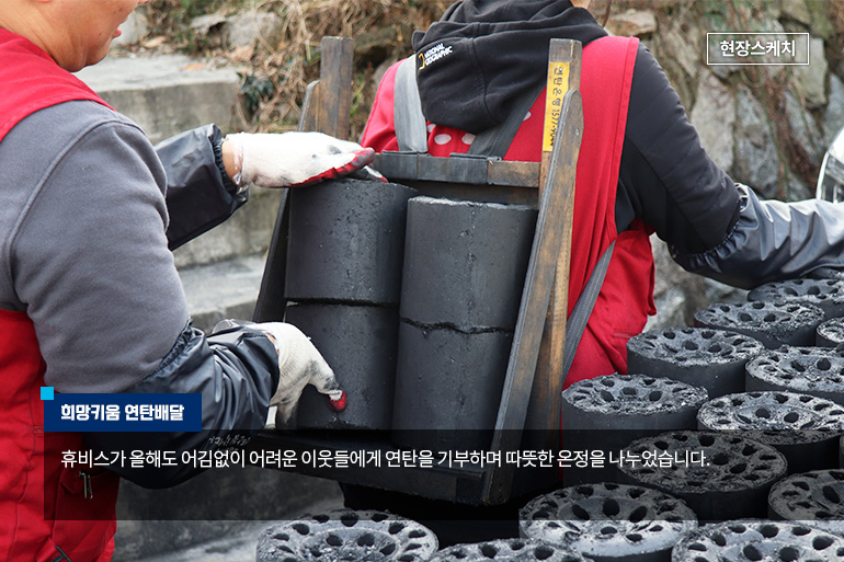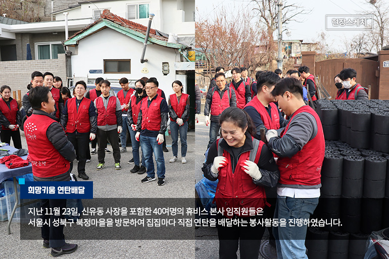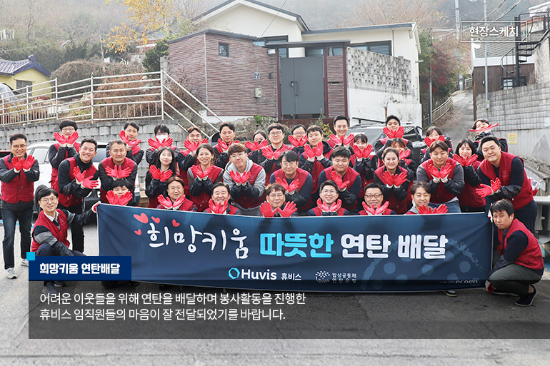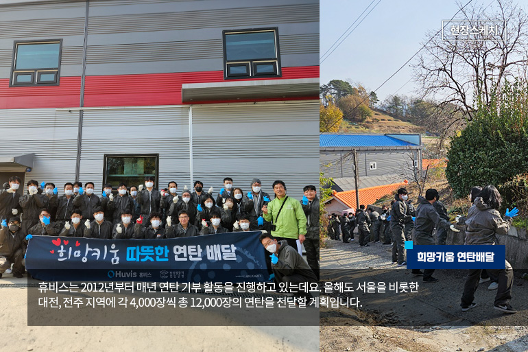 휴비스가 올해도 어김없이 전국 사업장 소재지 인근 어려운 이웃들의 겨울나기를 돕기 위해 연탄 기부 봉사활동을 진행하였습니다. 휴비스는 2012년부터 매년 연탄 기부 활동을 진행하고 있고, 올해는 서울과 대전, 전주 지역에 각 4,000장씩 총 12,000장의 연탄을 전달하였습니다.