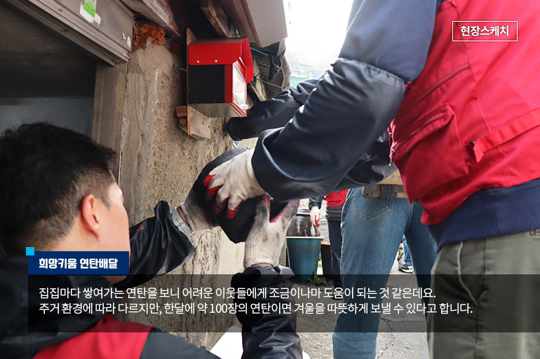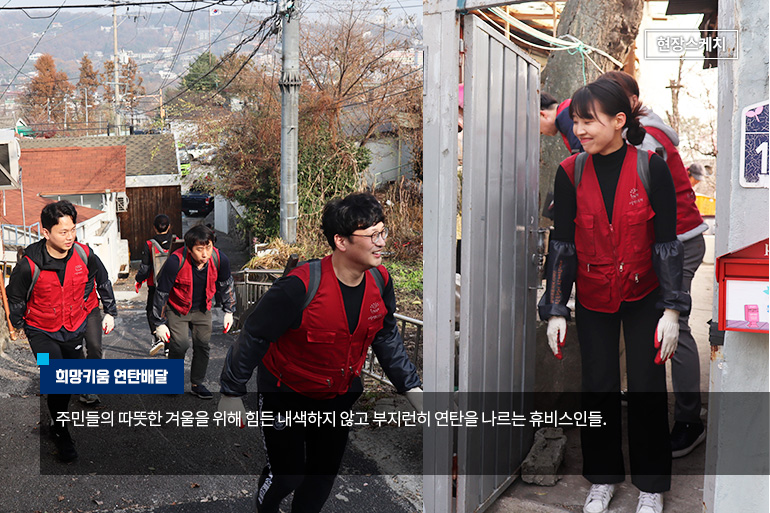 본사는 지난 11월 23일, 신유동 사장님을 포함한 40여명의 임직원들이 서울시 성북구 북정마을 일대에서 연탄 배달을 진행하였는데요. 현장의 생생한 모습을 사진과 함께 담아보았습니다.