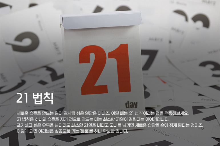 그런데 새로운 습관을 만드는 일이 말처럼 쉬운 일만은 아니죠. 이럴 때는 '21 법칙'이라는 것을 적용해보세요. 21 법칙은 하나의 습관을 자기 것으로 만드는 데는 최소한 21일이 걸린다는 이야기입니다. 포기하고 싶은 유혹을 받더라도 최소한 21일을 버티고 고비를 넘기면 새로운 습관을 손에 쥐게 된다는 것이죠. 이렇게 되면 여러분은 성공으로 가는 '통로'를 하나 확보한 겁니다.