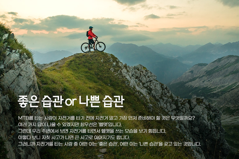 혹시 MTB(산악자전거)를 탄 본 적이 있으신지요? MTB를 타는 사람이 자전거를 타기 전에 자전거 말고 가장 먼저 준비해야 할 것은 무엇일까요? 여러 가지 답이 나올 수 있겠지만 최우선은 '헬맷'입니다. 그런데 우리 주변에서 보면 자전거를 타면서 헬맷을 쓰는 모습을 보기 힘듭니다. 이렇다 보니 자칫 사고가 나면 큰 사고로 이어지기도 합니다. 그러니까 자전거를 타는 사람 중 어떤 이는 '좋은 습관', 어떤 이는 '나쁜 습관'을 갖고 있는 것입니다.