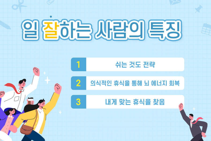 이처럼 잘 쉬는 사람이 일도 잘하는 이유는 충분한 휴식을 통해 높은 능률의 업무를 진행할 수 있는 에너지를 회복했기 때문입니다.